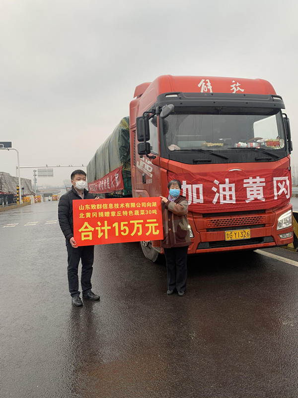 山东致群信息技术有限公司总经理李致文表示,疫情无情人有情,公司积极响应,为这次疫情奉献一份爱心,向湖北黄冈疫病灾区捐赠蔬菜30吨,以表达对疫区人民群众和前线医护工作者的慰问和支持。