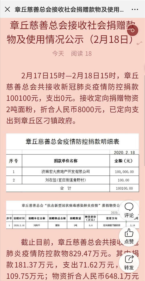 自发生疫情以来,章丘慈善总会认真贯彻落实党中央国务院和省、市、区委政府的决策部署,迅即投入到疫情防控攻坚战之中。 1月28日,章丘慈善总会全体工作人员到岗上班,慈善总会会长孟庆珍作了明确要求,要求全体工作人员积极行动起来,全力以赴参与到这场疫情防控中来。一是向全区社会各界及爱心人士发出了《关于开展抗击新型冠状病毒感染的肺炎疫情公开募捐倡议书》,广泛动员社会力量,为疫情防控奉献一份力量。二是开通24小时捐赠电话,安排专人及时接受捐赠款物。三是对接收捐赠款物及支出情况进行公示,每三天在电视台、报纸、章丘慈善总会网站公示一次,每日向区疫情防控指挥部报告一次,完全做到公开透明,让捐赠者放心。