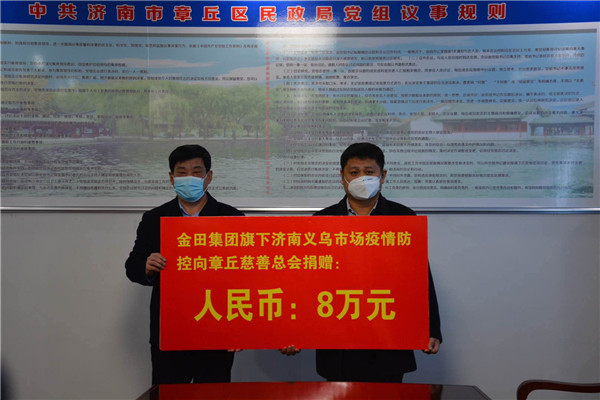 疫情无情,人间有爱。自《共战疫情,爱满章丘,开展抗击新型冠状病毒感染的肺炎疫情公开募捐倡议书》发布以来,社会各界及爱心人士纷纷行动,慷慨解囊捐款捐物,全力支援章丘新冠病毒肺炎疫情防控工作。2月3日,金田阳光投资集团济南公司总经理姜绍伟,总经理助理徐刚、王云霞等一行向我区捐赠8万元疫情防控爱心善款。章丘慈善总会会长孟庆珍、副会长李登泉,区民政局党组书记、局长张庆峰以及章丘慈善总会秘书长焦玲参与捐赠仪式。
